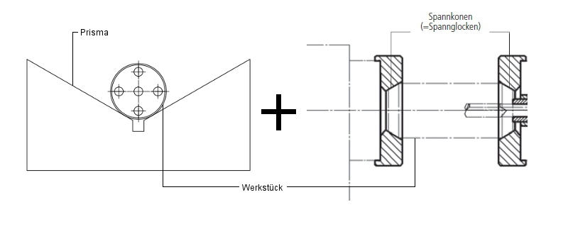 Rundmaterial mit zentrischer Tiefbohrung wird in Spannglocken (=Spannkonen) gespannt und sollte daher beidseitig angefast werden. Zur Führung des Bohrers wird eine Bohrbuchse (nicht dargestellt) am Werkstück angelegt, daher sollte das Rundmaterial beidseitig plangedreht werden.